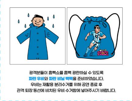 공연 현장에서 파란색 우비를 제공하지만, 보온용으로 활용하는 것이 좋아요. 공연 중에는 방수 효과가 크지 않으니 너무 의지하지 마세요!